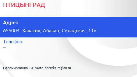 ПТИЦЫНГРАД по адресу 655004, Хакасия, Абакан, Складская, 11в в дальнейшем Организация, размещена в следующих категориях: