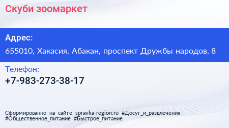 Скуби, зоомаркет по адресу 655010, Хакасия, Абакан, проспект Дружбы народов, 8 в дальнейшем Организация, размещена в следующих категориях: