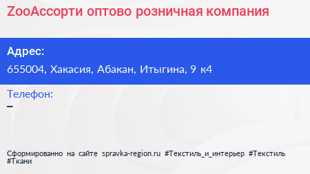 ZооАссорти, оптово-розничная компания по адресу 655004, Хакасия, Абакан, Итыгина, 9 к4 в дальнейшем Организация, размещена в следующих категориях: