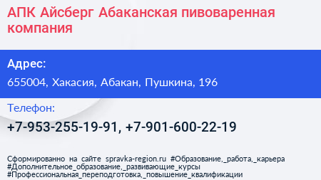 АПК Айсберг, Абаканская пивоваренная компания по адресу 655004, Хакасия, Абакан, Пушкина, 196 в дальнейшем Организация, размещена в следующих категориях: