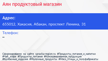 Аян, продуктовый магазин по адресу 655012, Хакасия, Абакан, проспект Ленина, 31 в дальнейшем Организация, размещена в следующих категориях: