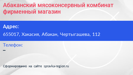 Абаканский мясоконсервный комбинат, фирменный магазин по адресу 655017, Хакасия, Абакан, Чертыгашева, 112 в дальнейшем Организация, размещена в следующих категориях: