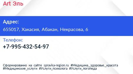 Art & Эль по адресу 655017, Хакасия, Абакан, Некрасова, 6 в дальнейшем Организация, размещена в следующих категориях: