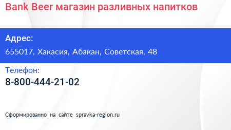 Bank Beer, магазин разливных напитков по адресу 655017, Хакасия, Абакан, Советская, 48 в дальнейшем Организация, размещена в следующих категориях: