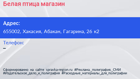 Белая птица, магазин по адресу 655002, Хакасия, Абакан, Гагарина, 26 к2 в дальнейшем Организация, размещена в следующих категориях: