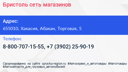Бристоль, сеть магазинов по адресу 655010, Хакасия, Абакан, Торговая, 5 в дальнейшем Организация, размещена в следующих категориях: