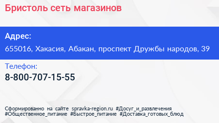 Бристоль, сеть магазинов по адресу 655016, Хакасия, Абакан, проспект Дружбы народов, 39 в дальнейшем Организация, размещена в следующих категориях: