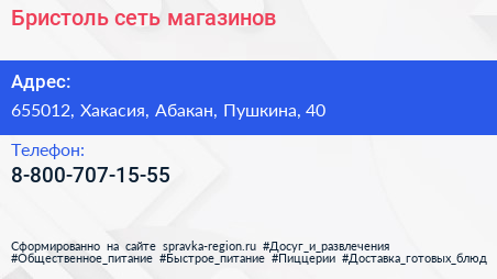 Бристоль, сеть магазинов по адресу 655012, Хакасия, Абакан, Пушкина, 40 в дальнейшем Организация, размещена в следующих категориях: