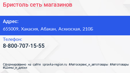 Бристоль, сеть магазинов по адресу 655009, Хакасия, Абакан, Аскизская, 210Б в дальнейшем Организация, размещена в следующих категориях: