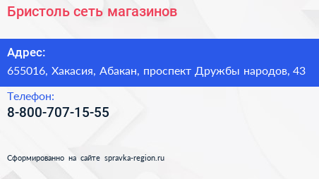 Бристоль, сеть магазинов по адресу 655016, Хакасия, Абакан, проспект Дружбы народов, 43 в дальнейшем Организация, размещена в следующих категориях: