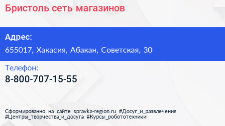 Бристоль, сеть магазинов по адресу 655017, Хакасия, Абакан, Советская, 30 в дальнейшем Организация, размещена в следующих категориях: