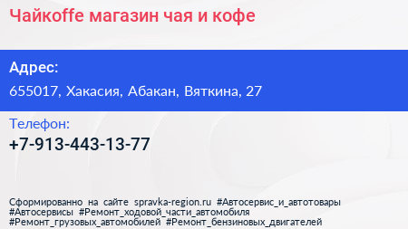 Чайкоffe, магазин чая и кофе по адресу 655017, Хакасия, Абакан, Вяткина, 27 в дальнейшем Организация, размещена в следующих категориях: