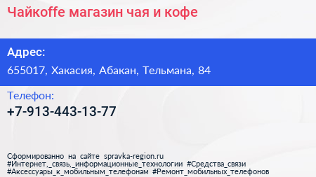 Чайкоffe, магазин чая и кофе по адресу 655017, Хакасия, Абакан, Тельмана, 84 в дальнейшем Организация, размещена в следующих категориях: