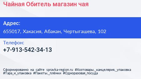 Чайная Обитель, магазин чая по адресу 655017, Хакасия, Абакан, Чертыгашева, 102 в дальнейшем Организация, размещена в следующих категориях:
