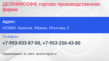 ДЕЛОМЯСОФФ, торгово-производственная фирма по адресу 655004, Хакасия, Абакан, Итыгина, 2 в дальнейшем Организация, размещена в следующих категориях: