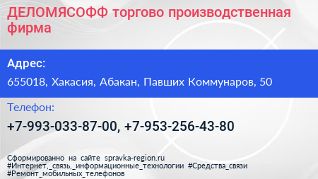 ДЕЛОМЯСОФФ, торгово-производственная фирма по адресу 655018, Хакасия, Абакан, Павших Коммунаров, 50 в дальнейшем Организация, размещена в следующих категориях: