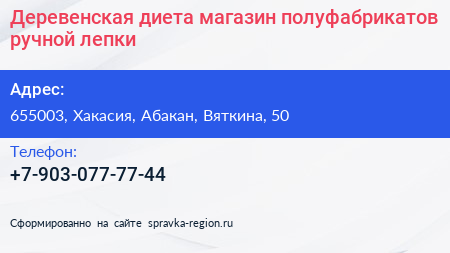 Деревенская диета, магазин полуфабрикатов ручной лепки по адресу 655003, Хакасия, Абакан, Вяткина, 50 в дальнейшем Организация, размещена в следующих категориях: