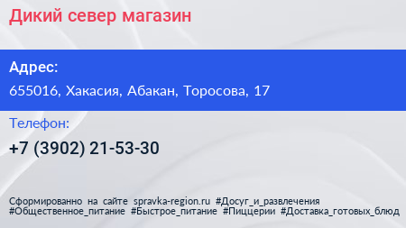 Дикий север, магазин по адресу 655016, Хакасия, Абакан, Торосова, 17 в дальнейшем Организация, размещена в следующих категориях: