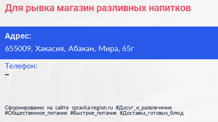 Для рывка, магазин разливных напитков по адресу 655009, Хакасия, Абакан, Мира, 65г в дальнейшем Организация, размещена в следующих категориях:
