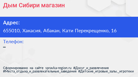 Дым Сибири, магазин по адресу 655010, Хакасия, Абакан, Кати Перекрещенко, 16 в дальнейшем Организация, размещена в следующих категориях: