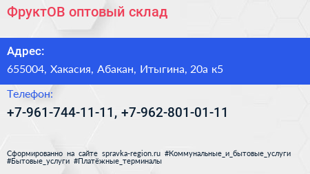 ФруктОВ, оптовый склад по адресу 655004, Хакасия, Абакан, Итыгина, 20а к5 в дальнейшем Организация, размещена в следующих категориях: