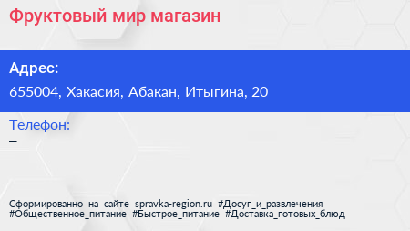 Фруктовый мир, магазин по адресу 655004, Хакасия, Абакан, Итыгина, 20 в дальнейшем Организация, размещена в следующих категориях: