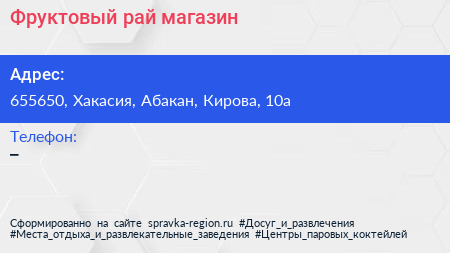 Фруктовый рай, магазин по адресу 655650, Хакасия, Абакан, Кирова, 10а в дальнейшем Организация, размещена в следующих категориях: