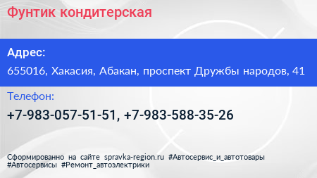 Фунтик, кондитерская по адресу 655016, Хакасия, Абакан, проспект Дружбы народов, 41 в дальнейшем Организация, размещена в следующих категориях: