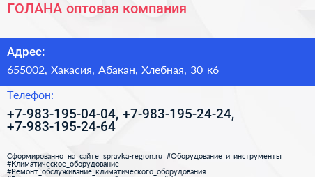 ГОЛАНА, оптовая компания по адресу 655002, Хакасия, Абакан, Хлебная, 30 к6 в дальнейшем Организация, размещена в следующих категориях: