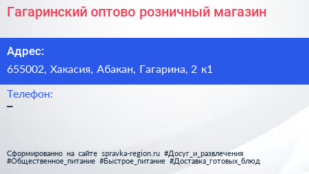 Гагаринский, оптово-розничный магазин по адресу 655002, Хакасия, Абакан, Гагарина, 2 к1 в дальнейшем Организация, размещена в следующих категориях: