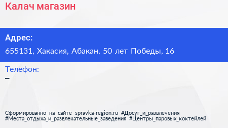 Калач, магазин по адресу 655131, Хакасия, Абакан, 50 лет Победы, 16 в дальнейшем Организация, размещена в следующих категориях: