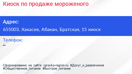 Киоск по продаже мороженого по адресу 655003, Хакасия, Абакан, Братская, 15 киоск в дальнейшем Организация, размещена в следующих категориях: