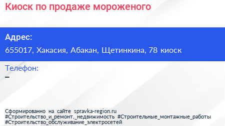Киоск по продаже мороженого по адресу 655017, Хакасия, Абакан, Щетинкина, 78 киоск в дальнейшем Организация, размещена в следующих категориях: