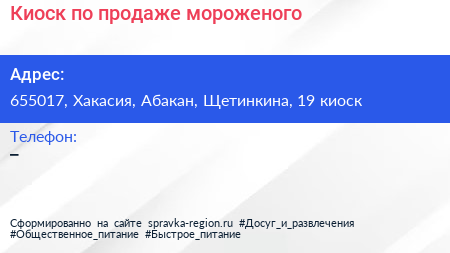 Киоск по продаже мороженого по адресу 655017, Хакасия, Абакан, Щетинкина, 19 киоск в дальнейшем Организация, размещена в следующих категориях: