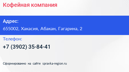 Кофейная компания по адресу 655002, Хакасия, Абакан, Гагарина, 2 в дальнейшем Организация, размещена в следующих категориях: