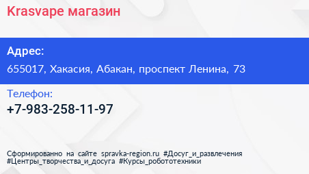 Krasvape, магазин по адресу 655017, Хакасия, Абакан, проспект Ленина, 73 в дальнейшем Организация, размещена в следующих категориях: