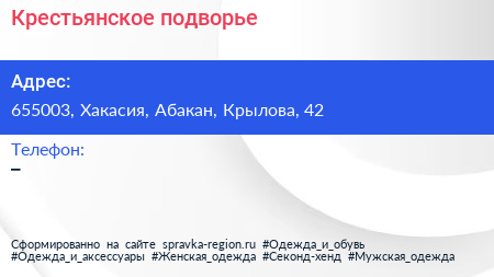 Крестьянское подворье по адресу 655003, Хакасия, Абакан, Крылова, 42 в дальнейшем Организация, размещена в следующих категориях: