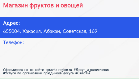 Магазин фруктов и овощей по адресу 655004, Хакасия, Абакан, Советская, 169 в дальнейшем Организация, размещена в следующих категориях: