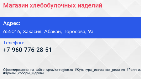 Магазин хлебобулочных изделий по адресу 655016, Хакасия, Абакан, Торосова, 9а в дальнейшем Организация, размещена в следующих категориях: