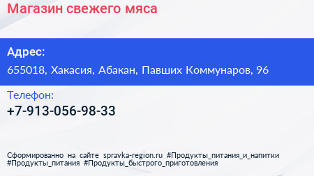 Магазин свежего мяса по адресу 655018, Хакасия, Абакан, Павших Коммунаров, 96 в дальнейшем Организация, размещена в следующих категориях: