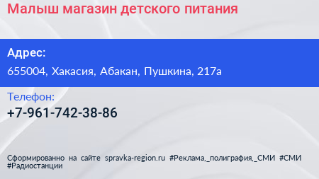 Малыш, магазин детского питания по адресу 655004, Хакасия, Абакан, Пушкина, 217а в дальнейшем Организация, размещена в следующих категориях: