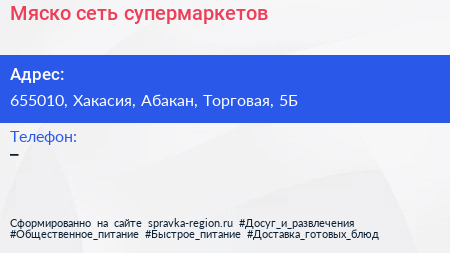 Мяско, сеть супермаркетов по адресу 655010, Хакасия, Абакан, Торговая, 5Б в дальнейшем Организация, размещена в следующих категориях: