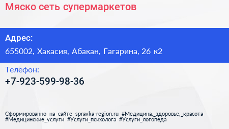 Мяско, сеть супермаркетов по адресу 655002, Хакасия, Абакан, Гагарина, 26 к2 в дальнейшем Организация, размещена в следующих категориях:
