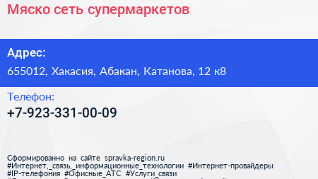 Мяско, сеть супермаркетов по адресу 655012, Хакасия, Абакан, Катанова, 12 к8 в дальнейшем Организация, размещена в следующих категориях: