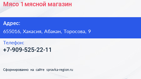 Мясо №1, мясной магазин по адресу 655016, Хакасия, Абакан, Торосова, 9 в дальнейшем Организация, размещена в следующих категориях: