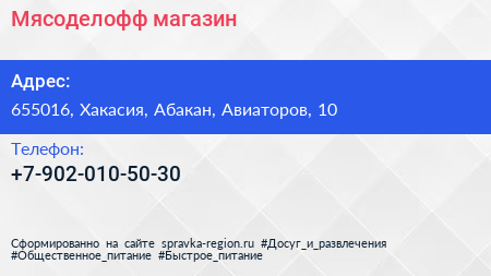 Мясоделофф, магазин по адресу 655016, Хакасия, Абакан, Авиаторов, 10 в дальнейшем Организация, размещена в следующих категориях:
