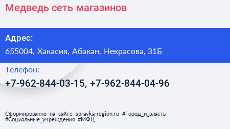 Медведь, сеть магазинов по адресу 655004, Хакасия, Абакан, Некрасова, 31Б в дальнейшем Организация, размещена в следующих категориях: