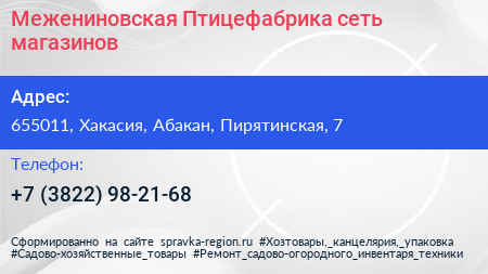 Межениновская Птицефабрика, сеть магазинов по адресу 655011, Хакасия, Абакан, Пирятинская, 7 в дальнейшем Организация, размещена в следующих категориях: