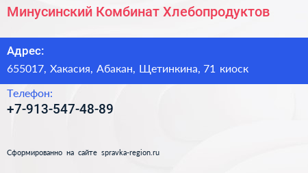 Минусинский Комбинат Хлебопродуктов по адресу 655017, Хакасия, Абакан, Щетинкина, 71 киоск в дальнейшем Организация, размещена в следующих категориях:
