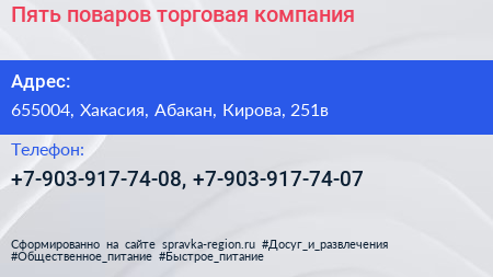 Пять поваров, торговая компания по адресу 655004, Хакасия, Абакан, Кирова, 251в в дальнейшем Организация, размещена в следующих категориях: